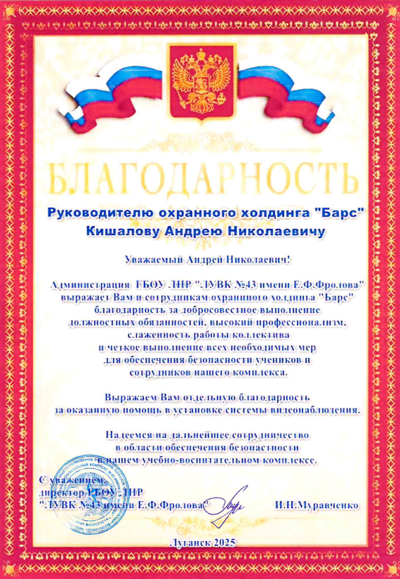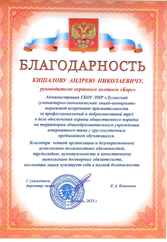 Смотреть оригиналБлагодарность генеральному директору охранного холдинга «БАРС» Кишалову А.Н. от «Стахановский политехнический колледж» ЛНР за высокий профессионализм и организацию работы на охраняемых объектах