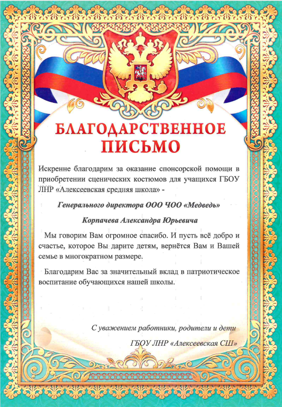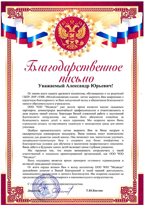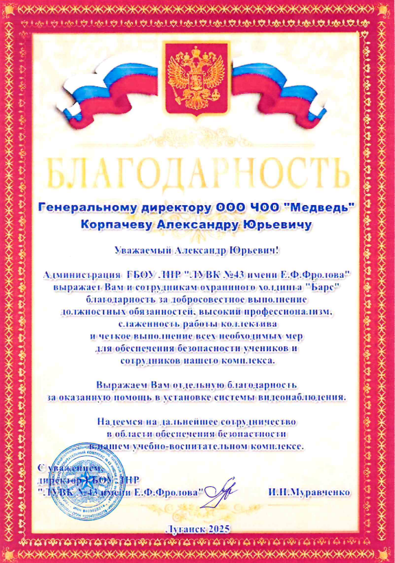 Смотреть оригиналБлагодарность ЧОП «Медведь» от администрации ГОУ ЛНР «Хорошенская СШ им. А. Ерёменко»