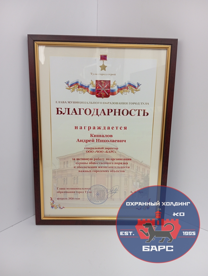 За оказанную помощь в раскрытии ряда тяжких уголовных преступлений на территории города Тулы, а также за высокую профессиональную подготовку сотрудников и высококвалифицированную помощь в охране правопорядка на территории города Охранный холдинг «БАРС» награжден почетной грамотой Начальником УМВД России по г. Туле полковником полиции И.Ф. Роденковым.
