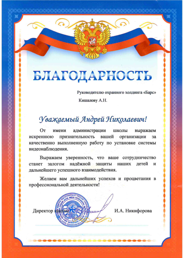 Благодарность генеральному директору охранного холдинга «БАРС» Кишалову А.Н.