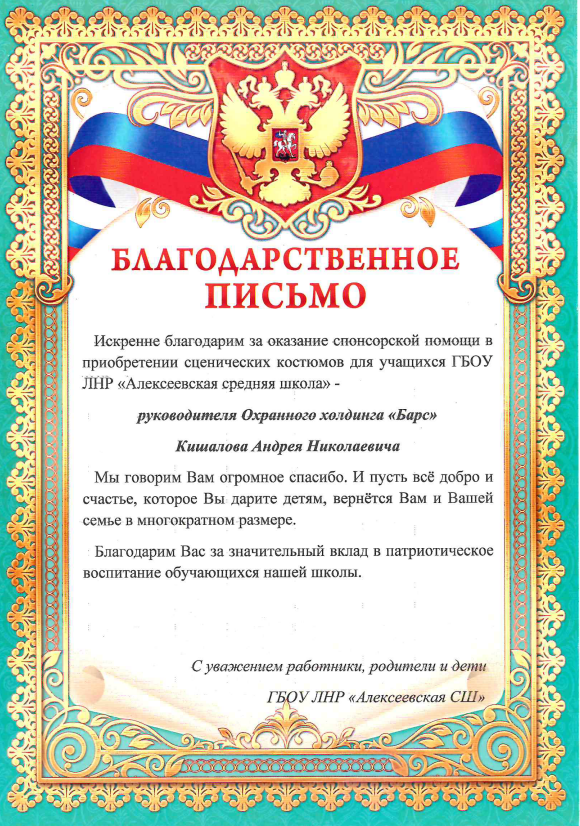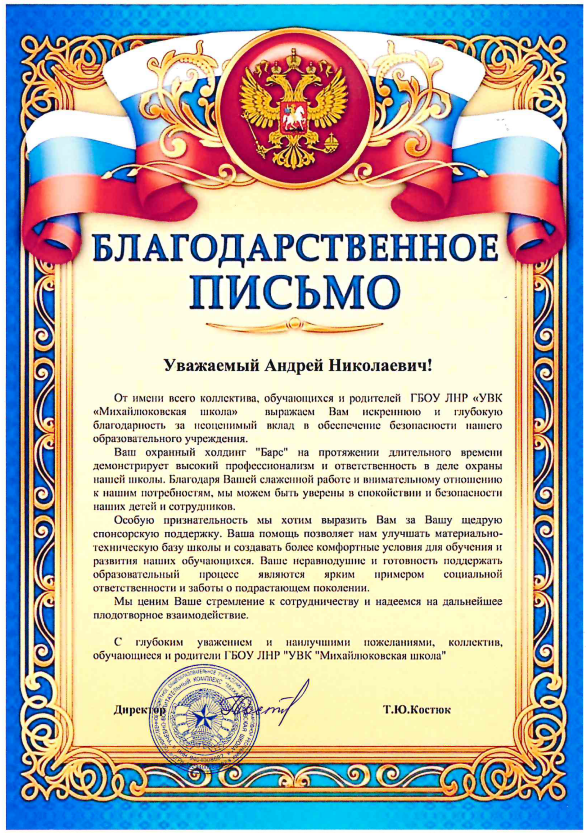 Смотреть оригиналБлагодарственное письмо директору охранного холдинга А.Е.Кишалову «БАРС» от администрации ГОУ ЛНР «Лотиковская СШ им В.Лелеки»